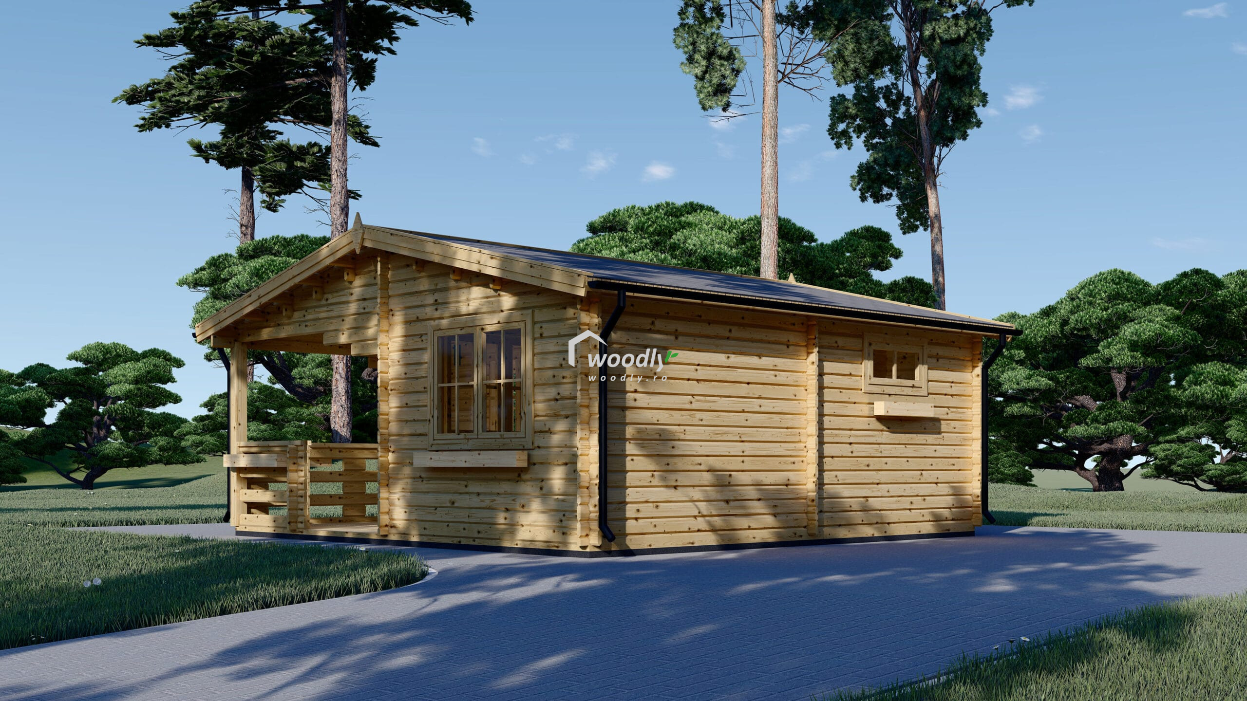 Cabană din lemn la cheie, OLIVIA, modulară, 35mp, living, dormitor, baie, terasă, 6x6m, perete 44mm. Montaj/vopsit realizat de echipa Woodly in jud. B...More