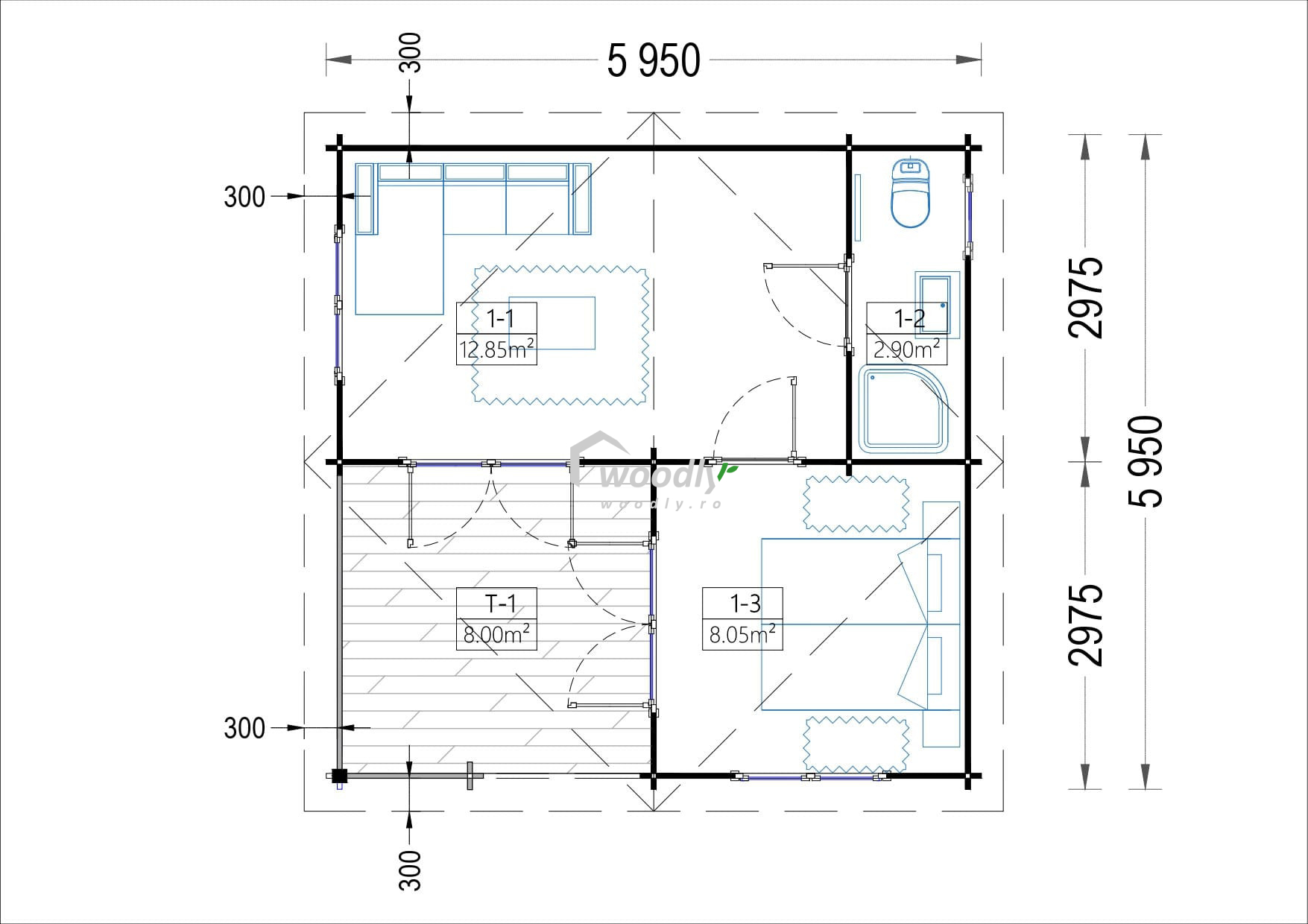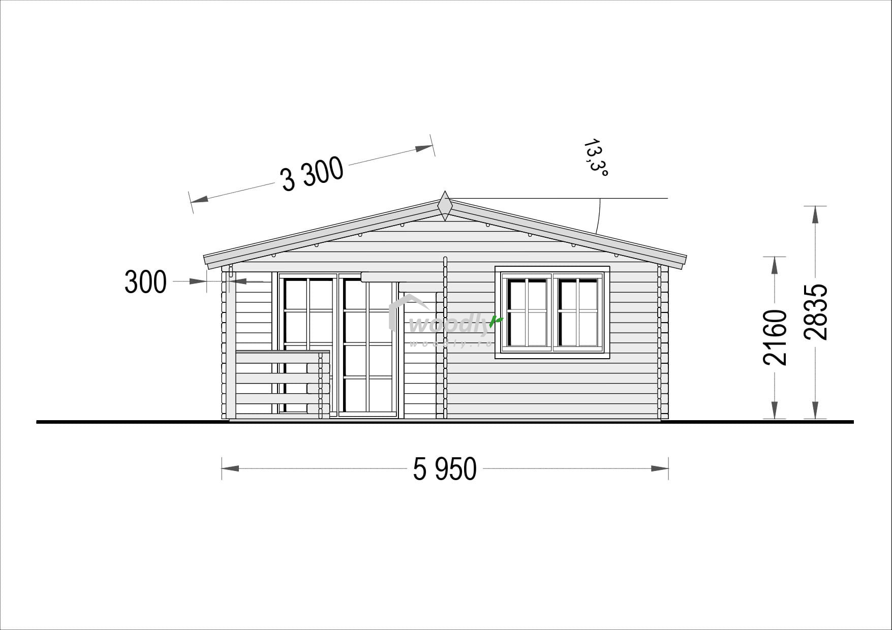 Cabană din lemn la cheie, OLIVIA, modulara, izolată, 35mp, living, dormitor, baie, terasă, 6x6m, perete dublu de 34mm + Izolație + 34mm