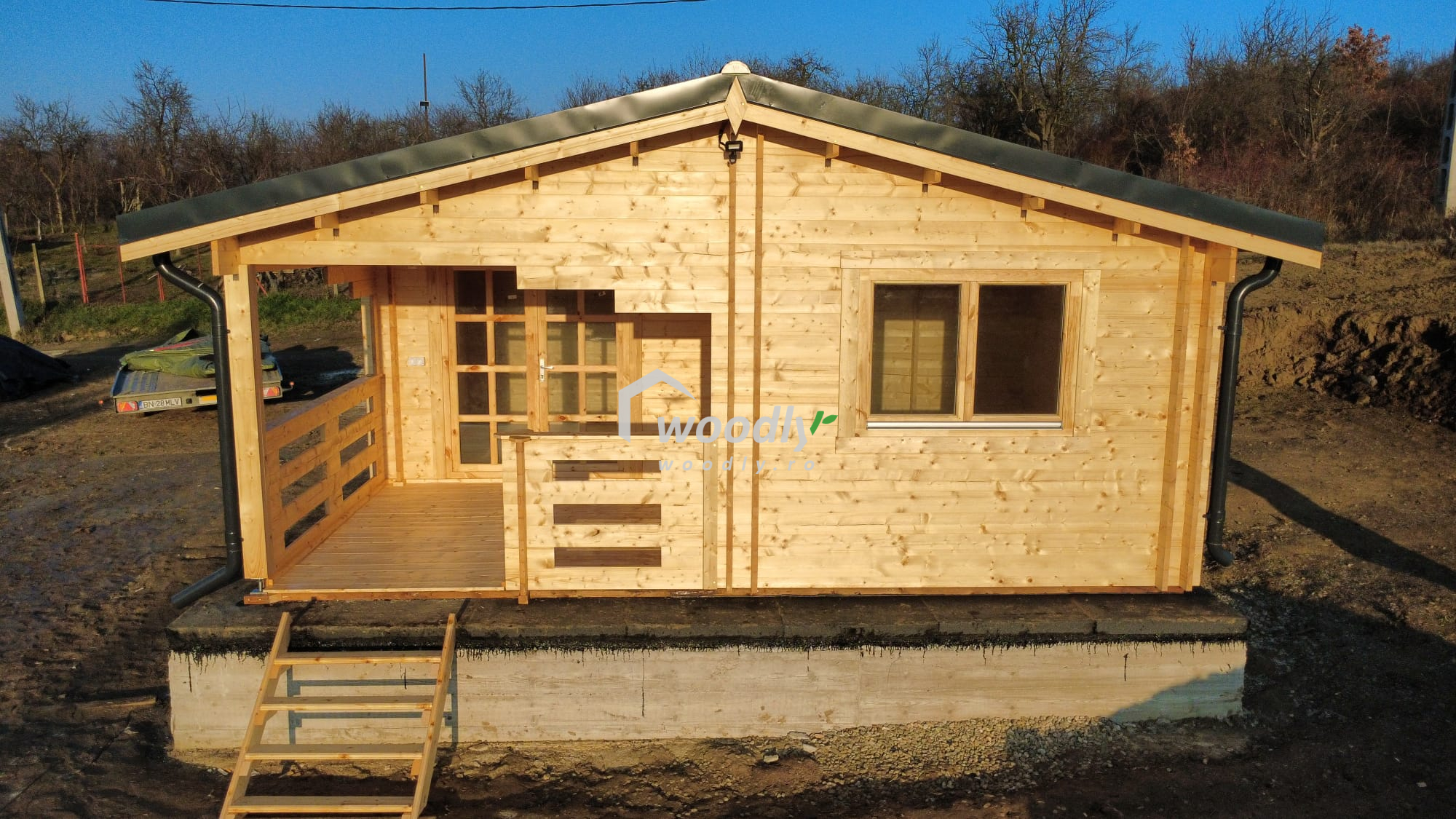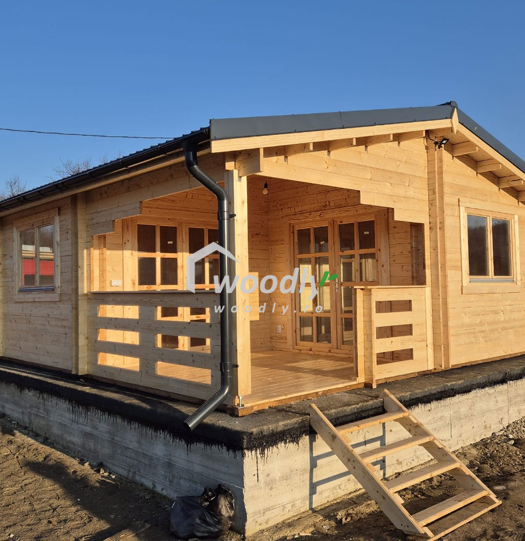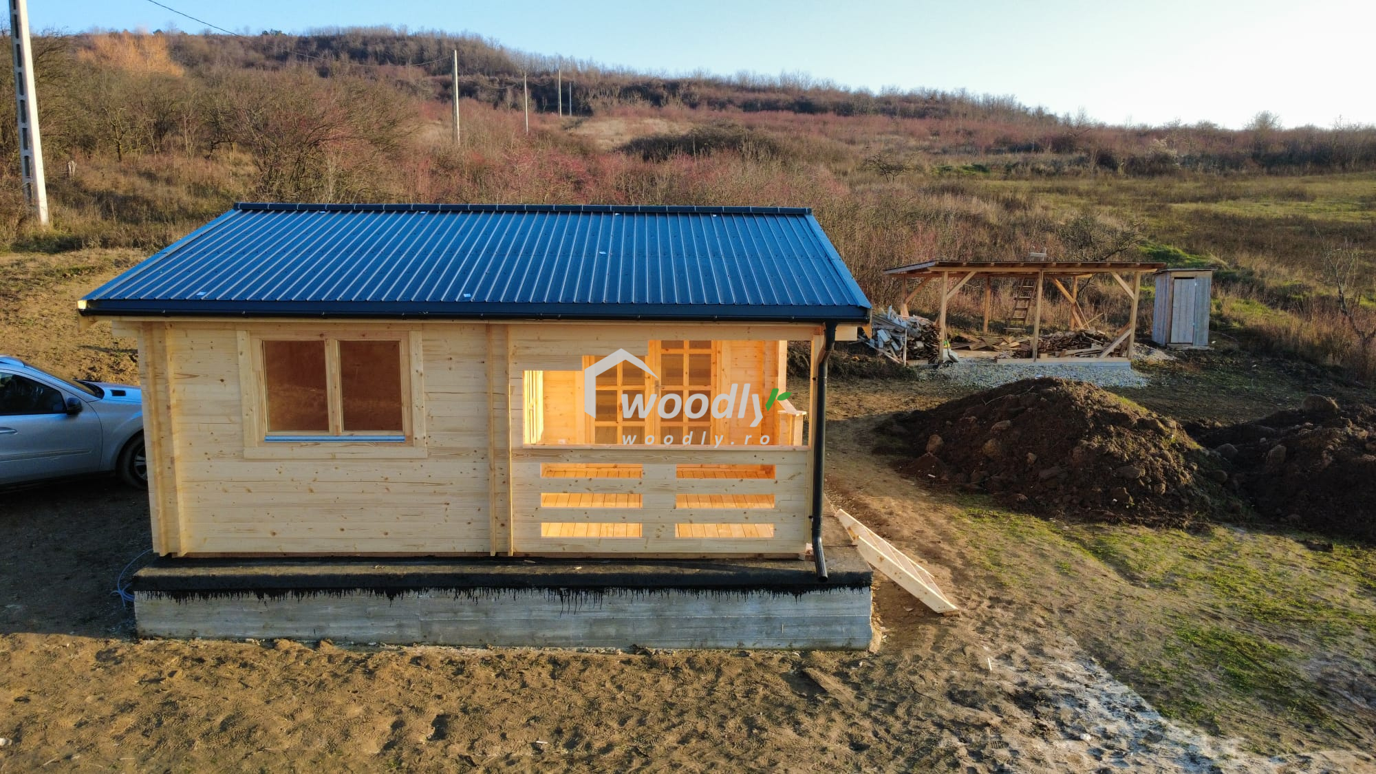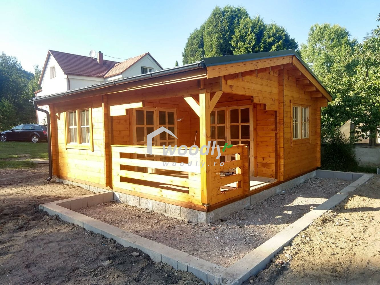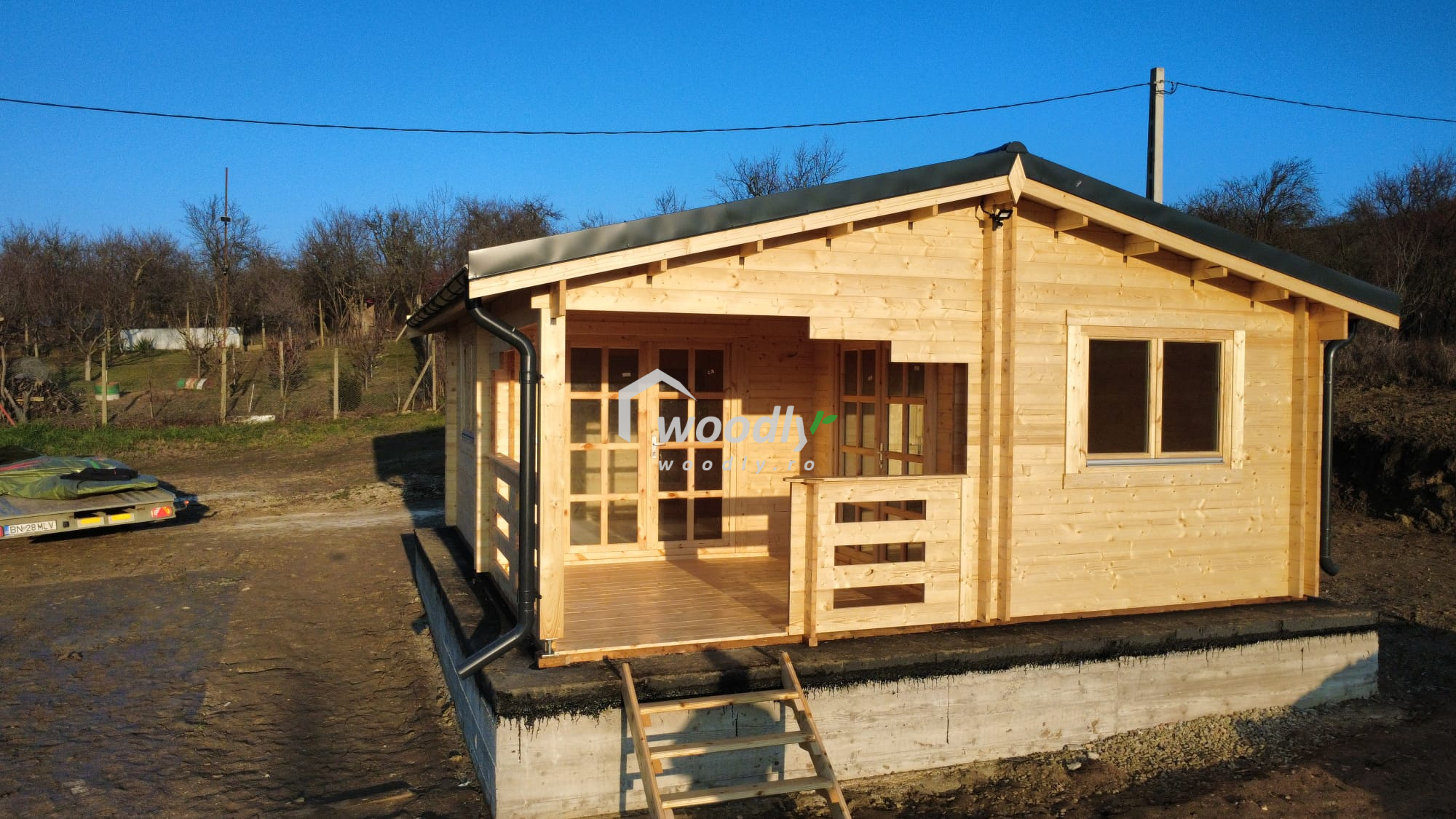 Cabană din lemn la cheie, OLIVIA, modulară, 35mp, living, dormitor, baie, terasă, 6x6m, perete 44mm. Montaj/vopsit realizat de echipa Woodly in jud. Bihor
