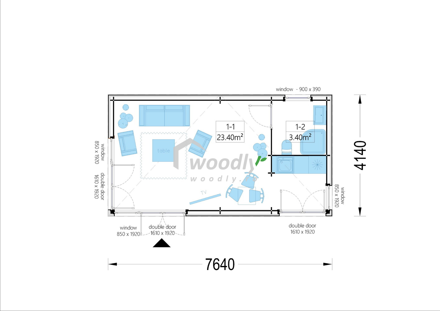 Casa din lemn izolată PREMIUM, cu perete dublu și izolare, cu o cameră, o zonă mare de zi, chicinetă și baie. Este ideală pentru o locuință confortabilă și eficientă energetică, perfectă pentru cei care care caută un spațiu versatil.
