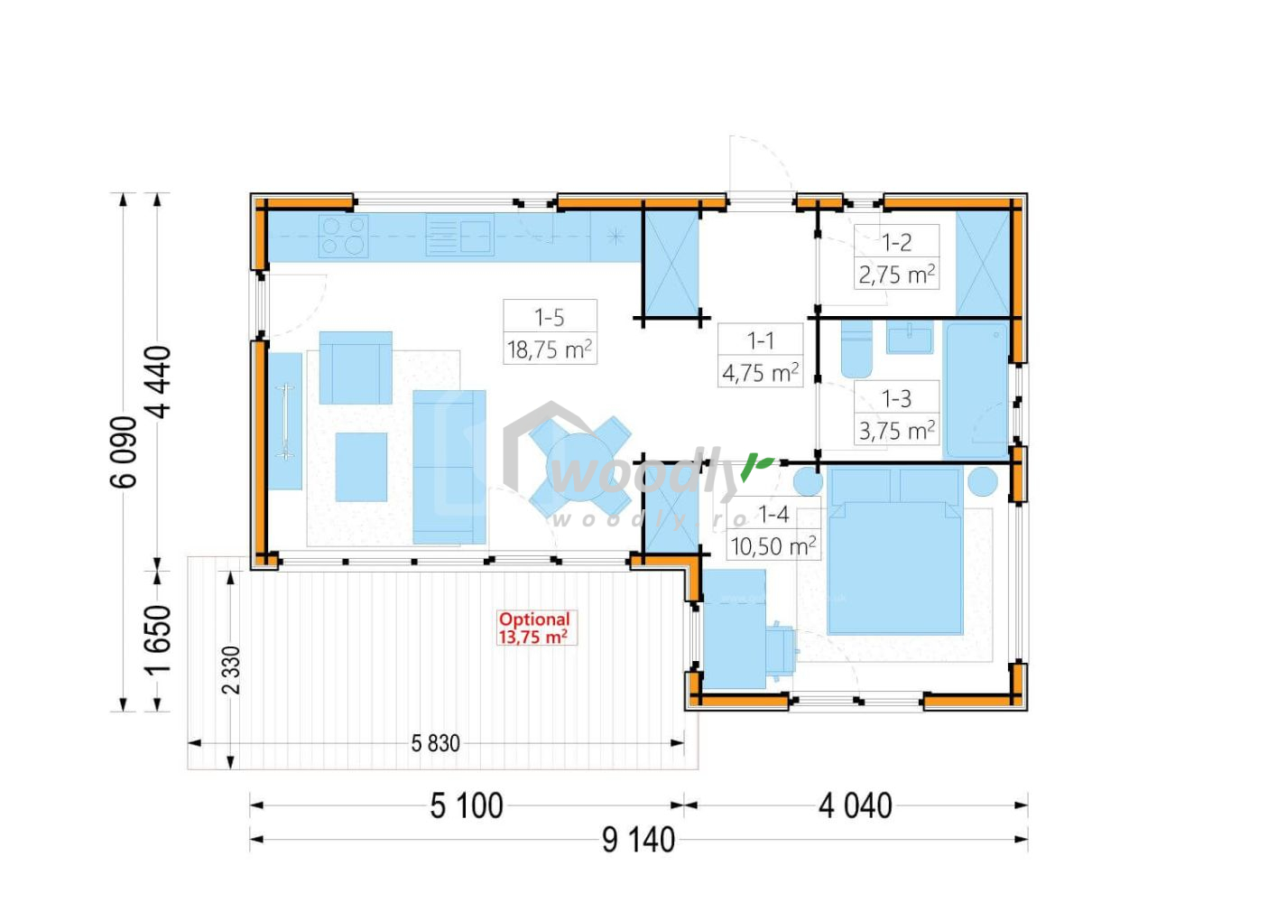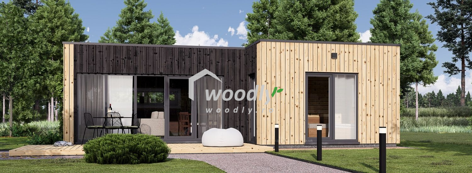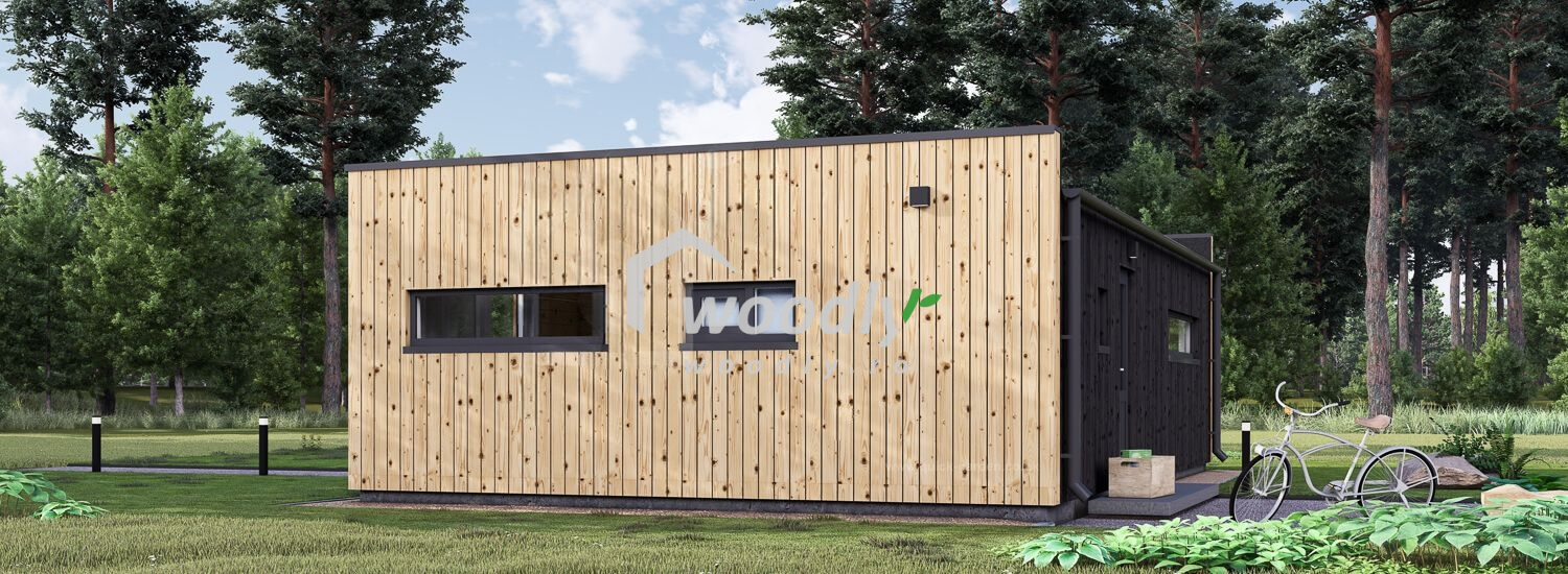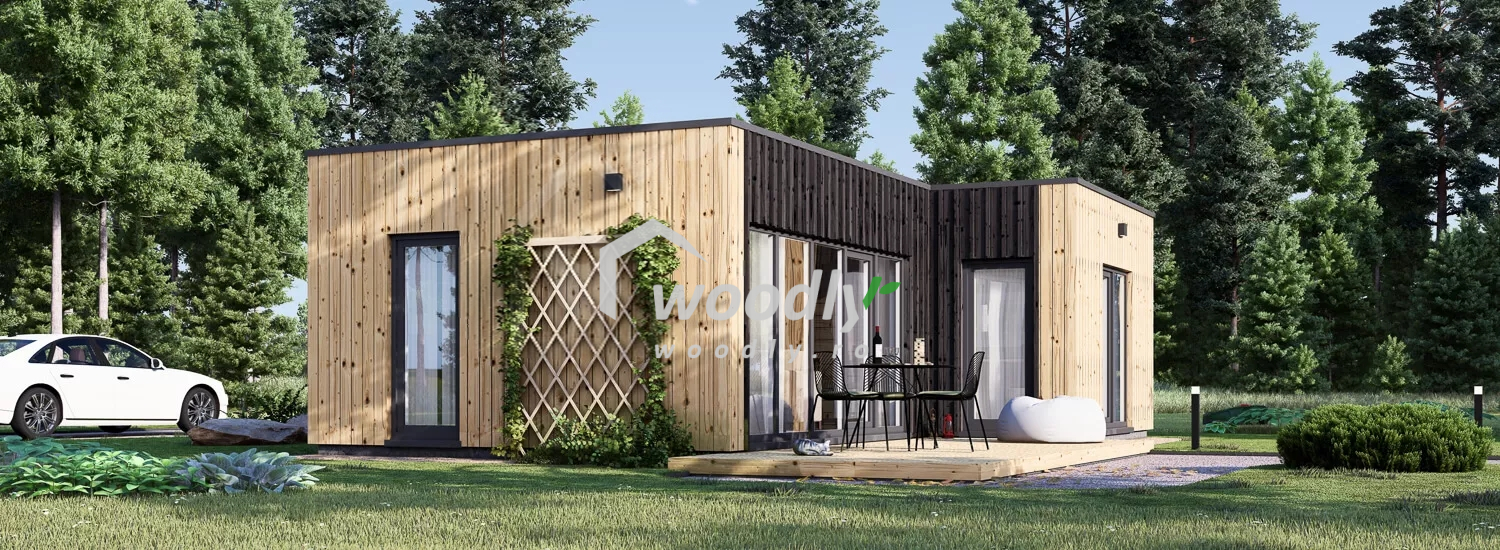 Casă din lemn la cheie, LUCIA 1, modulară, izolată, 40mp, forma L, living, dormitor, baie, perete dublu de 44mm + izolație + 20 mm, 9x6m,