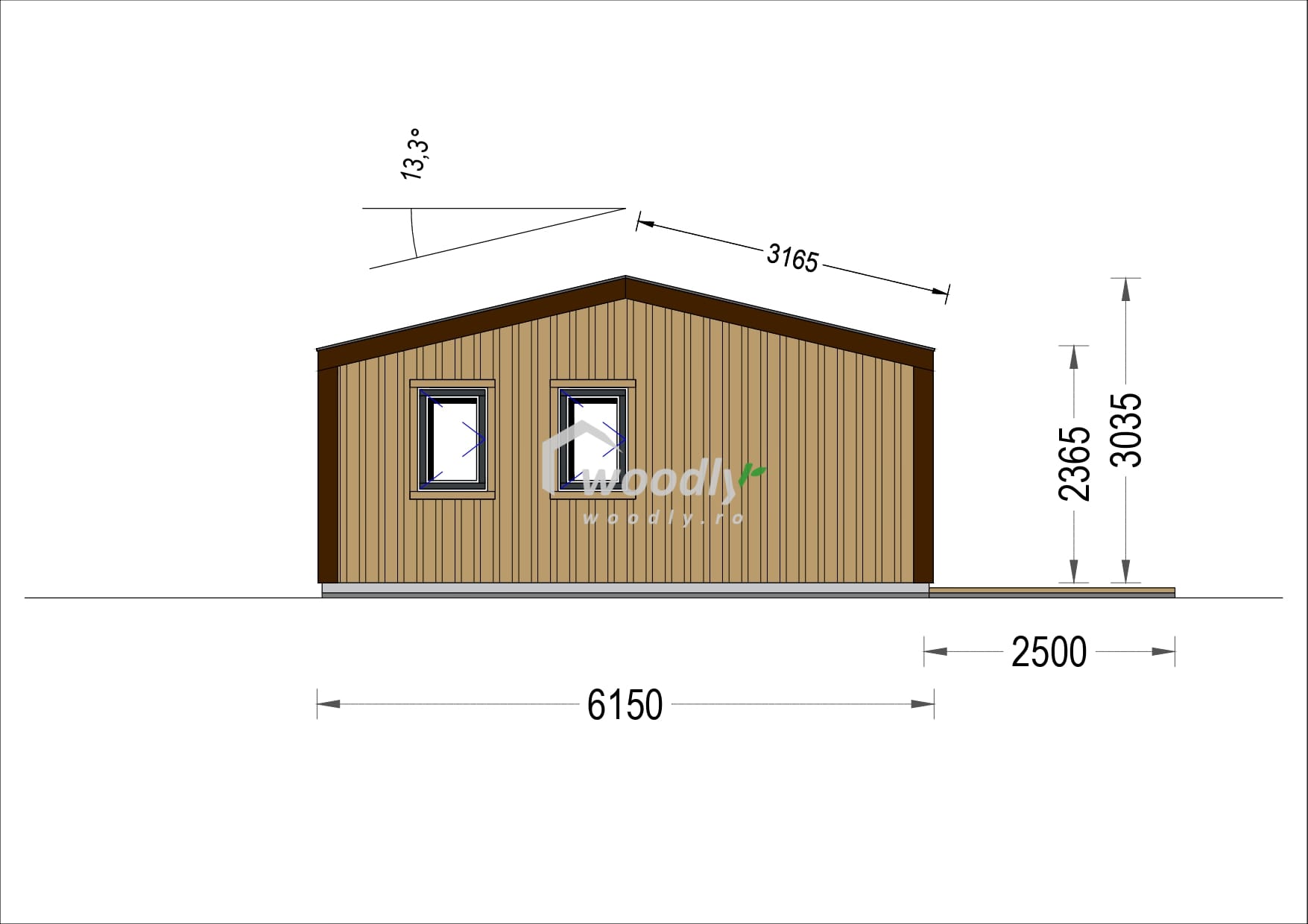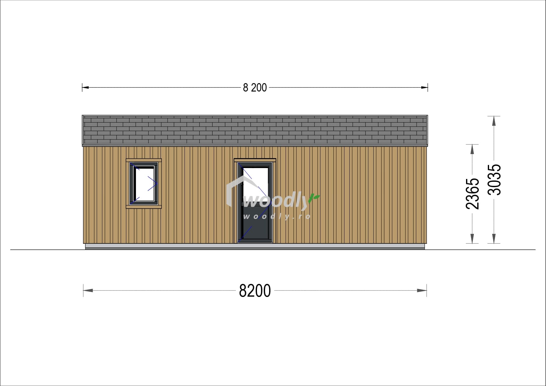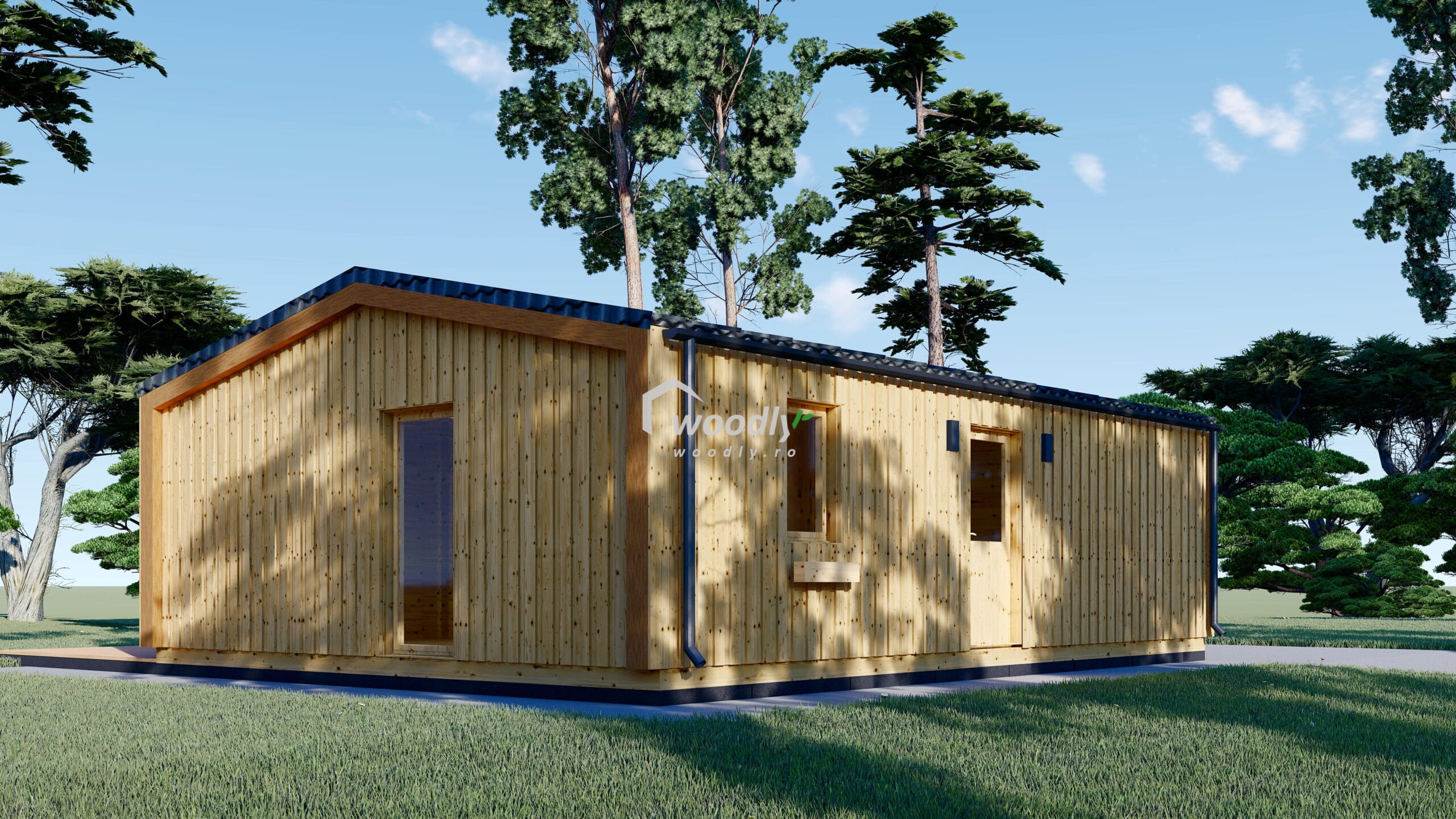 Casă din lemn la cheie, ANGELA, modulară, izolată, 50mp, living, dormitor, baie, dressing, cameră tehnică, perete dublu de 44mm + Izolație + 20mm, 8x6m