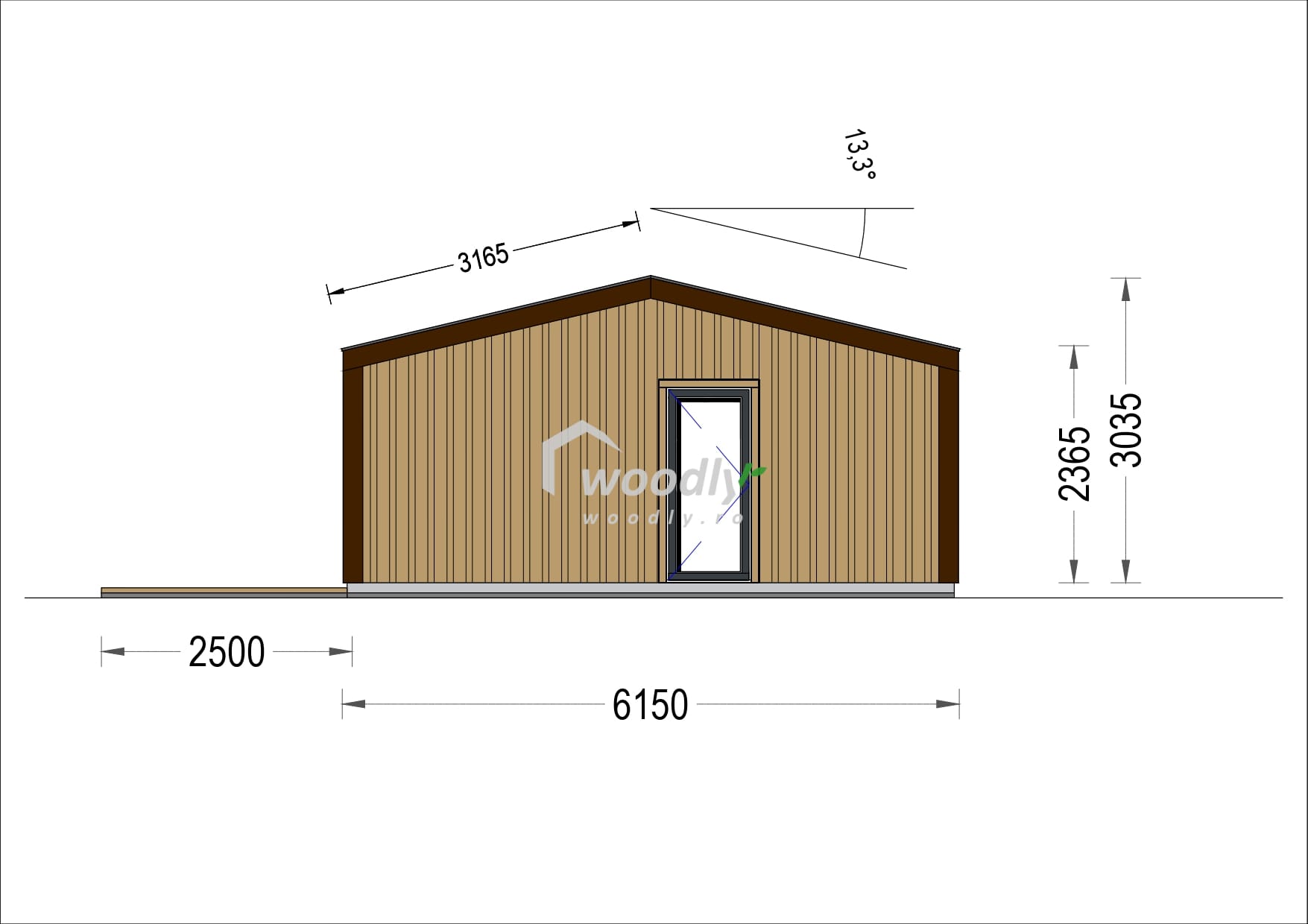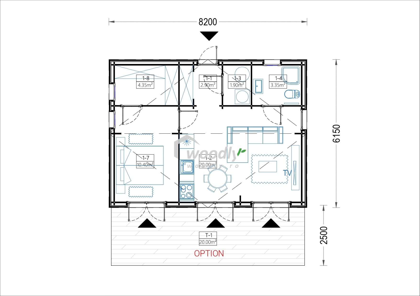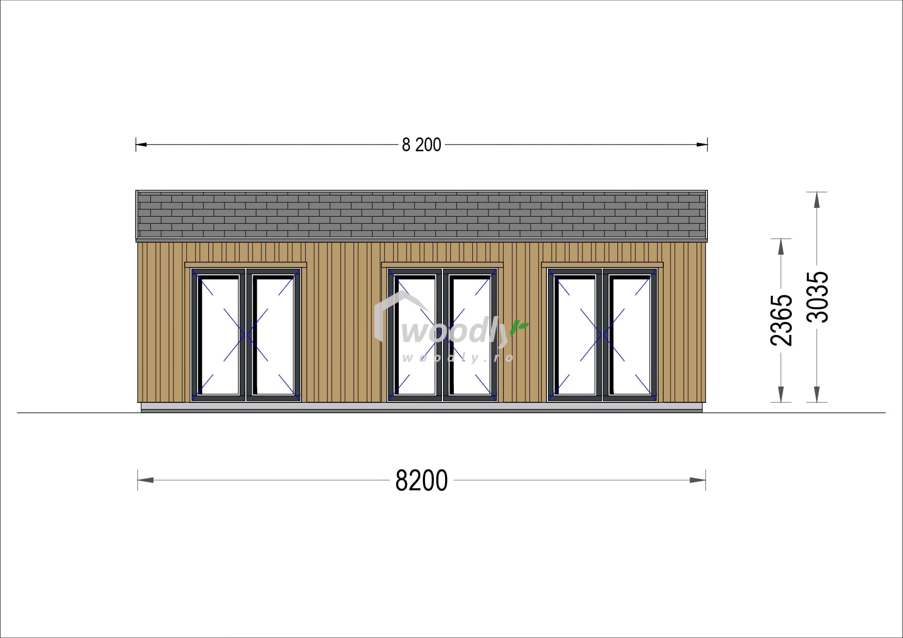 Casă din lemn la cheie, ANGELA, modulară, izolată, 50mp, living, dormitor, baie, dressing, cameră tehnică, perete dublu de 44mm + Izolație + 20mm, 8x6m