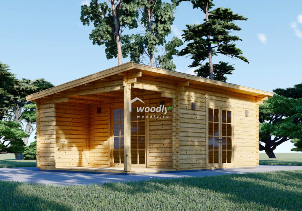 Casa din lemn CARL 28mp, cu terasă acoperită de 8mp, uși duble cu geam termoizolant și acoperiș modern cu surplombă laterală, ideală pentru relaxare, cine în aer liber și escapade de weekend!