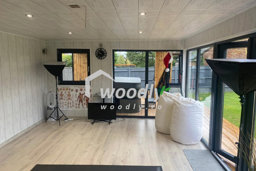 Interiorul căsuței din lemn ESSEX oferă libertatea să creeze spațiul perfect pentru nevoile tale. Poți amenaja un birou de grădină, un atelier de creație sau un loc de relaxare. Ușile vitrate și ferestrele mari aduc lumină naturală din abundență și creează o conexiune plăcută cu exteriorul. Vara, căsuța ESSEX devine un spațiu răcoros și aerisit. Iarna, te poți bucura de un refugiu protejat și confortabil. Cu această căsuță de grădină modernă, fiecare metru pătrat este valorificat la maximum.
