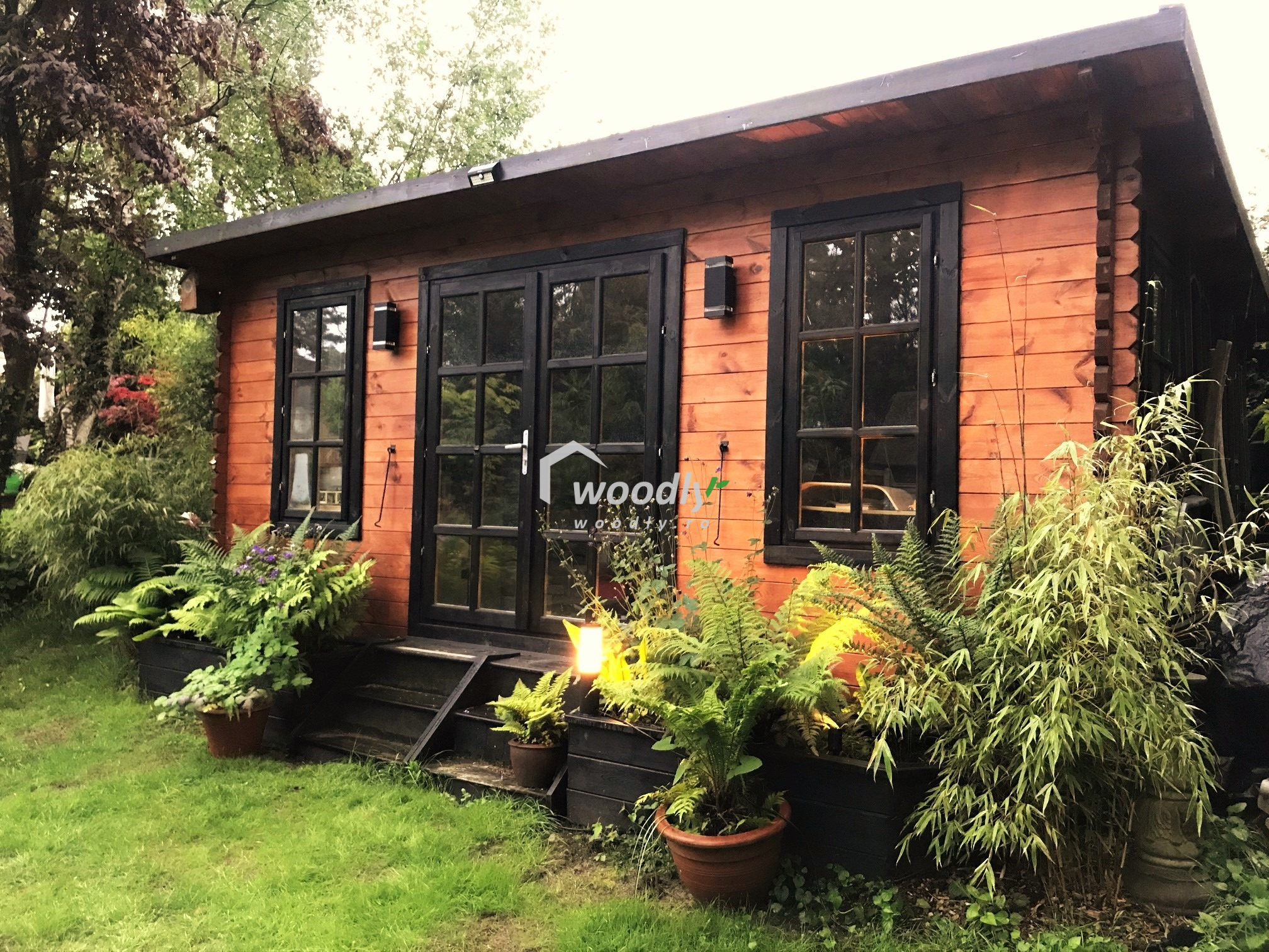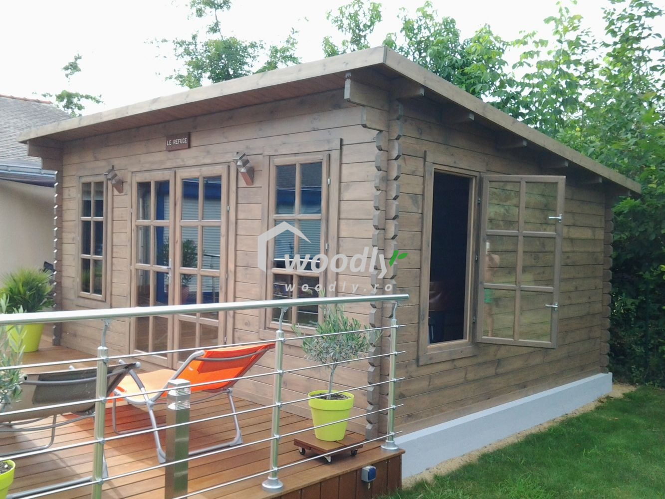 Căsuță de grădină din lemn 20 mp, cu acoperiș extins și design modern, oferă o zonă luminoasă și confortabilă, ideală pentru relaxare sau activități diverse.