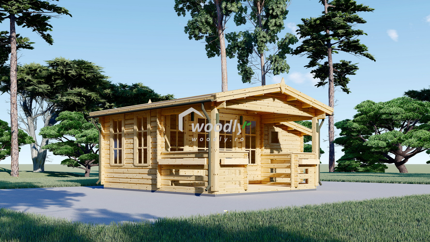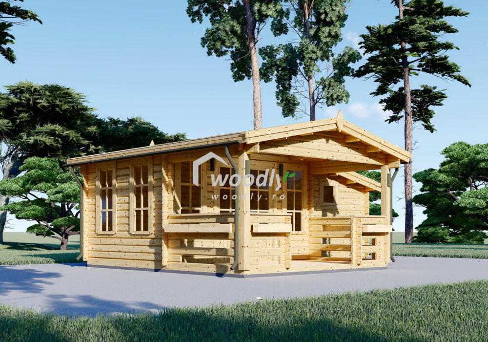 Căsuță de grădină din lemn ISLA, 25 mp, cu terasă acoperită de 7 mp, ferestre cu geam dublu și compartimentare flexibilă, ideală pentru relaxare sau activități de vară.