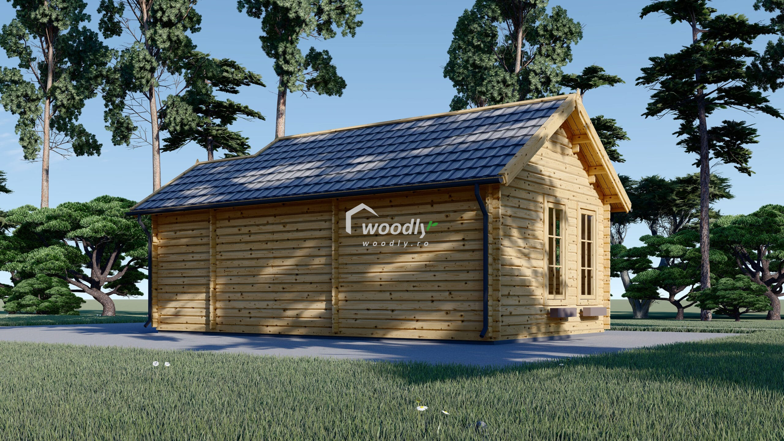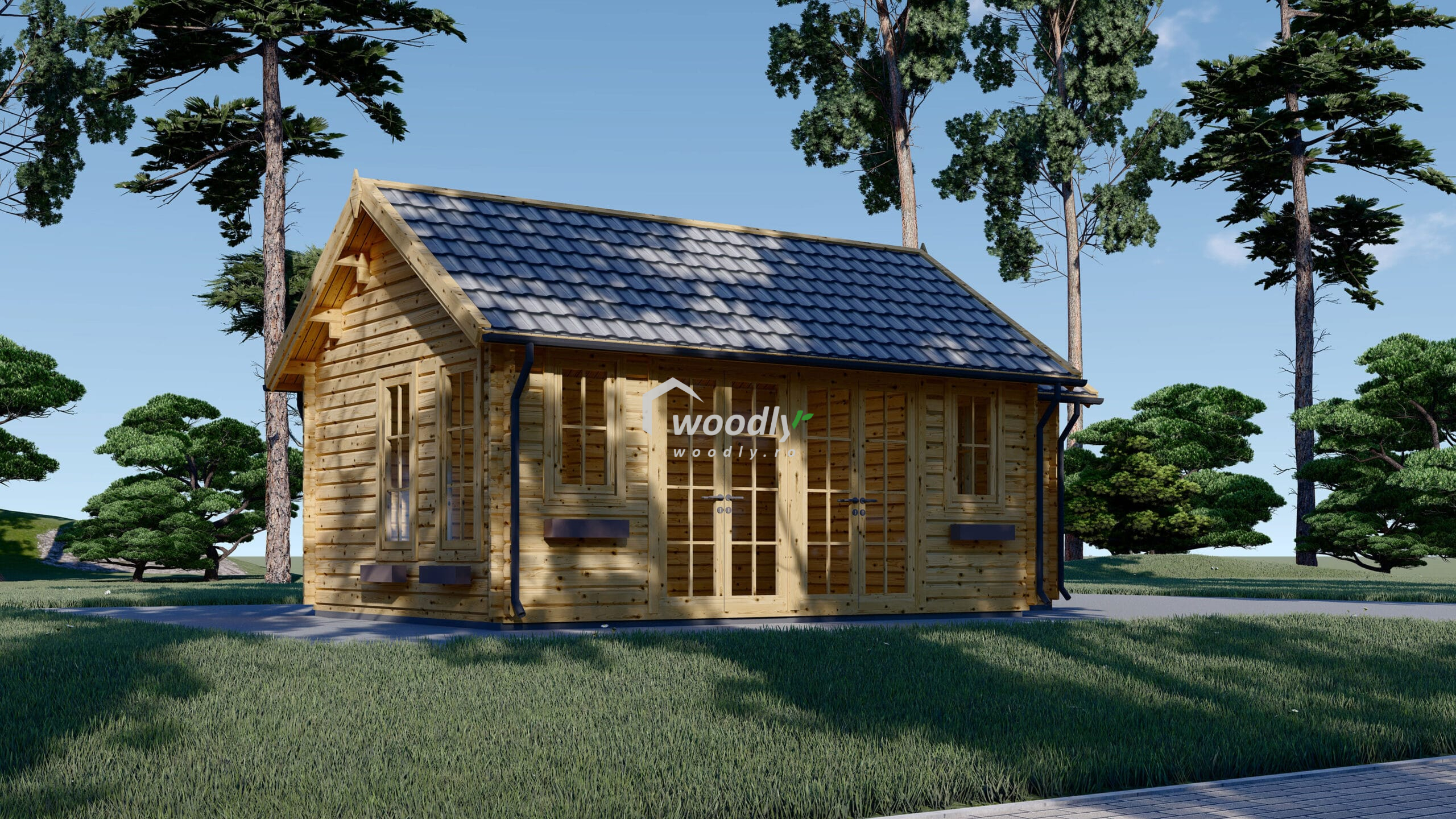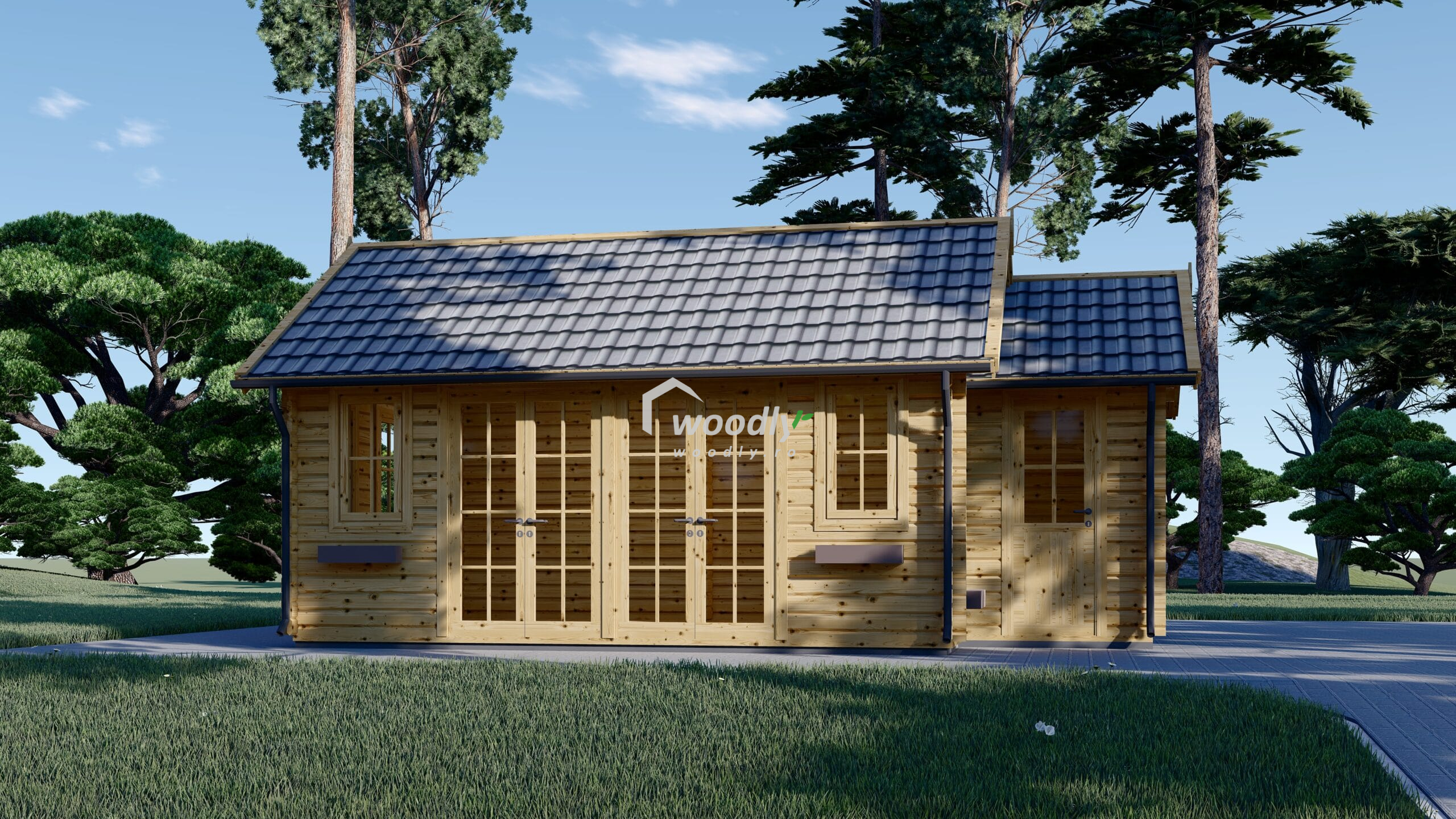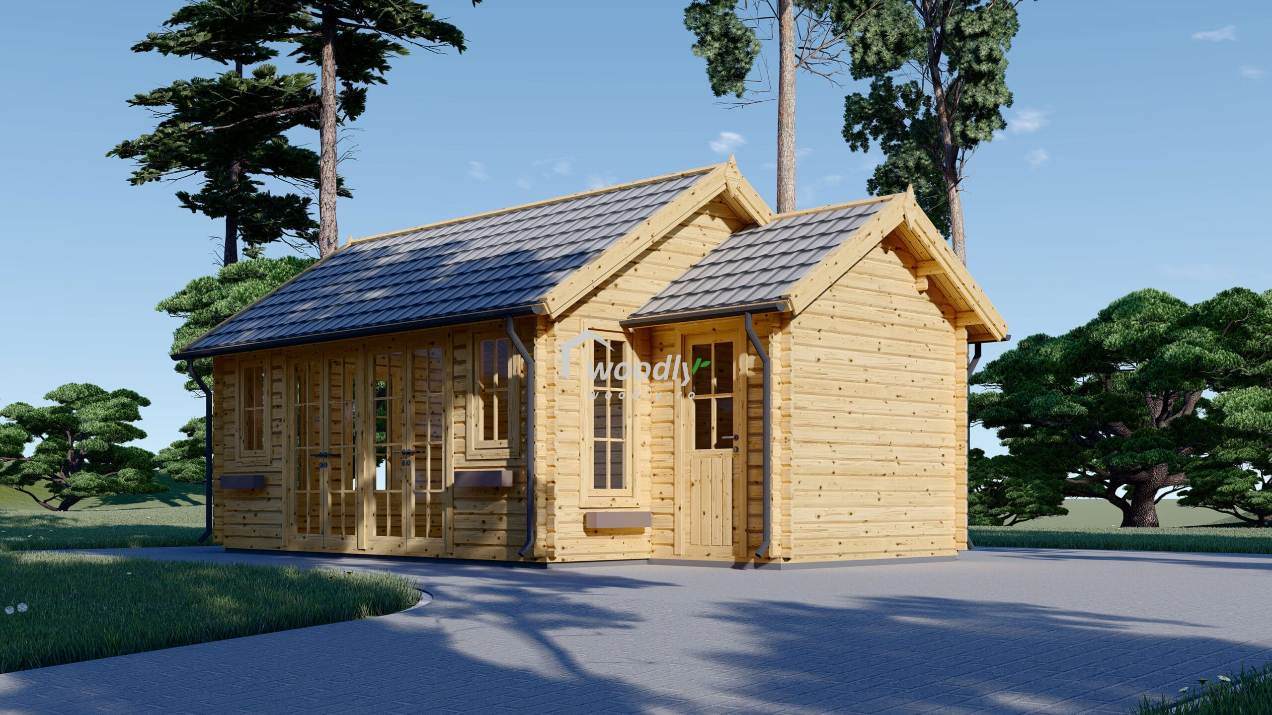 Căsuța ELLA se remarcă prin designul său elegant, cu o fațadă vitrată mare care permite pătrunderea generoasă a luminii naturale. Pridvorul spațios oferă un loc ideal pentru relaxare la aer curat, protejat de razele puternice ale soarelui sau de ploaie. Acoperișul în două ape completează aspectul estetic și funcționalitatea, oferind o protecție sporită împotriva intemperiilor.