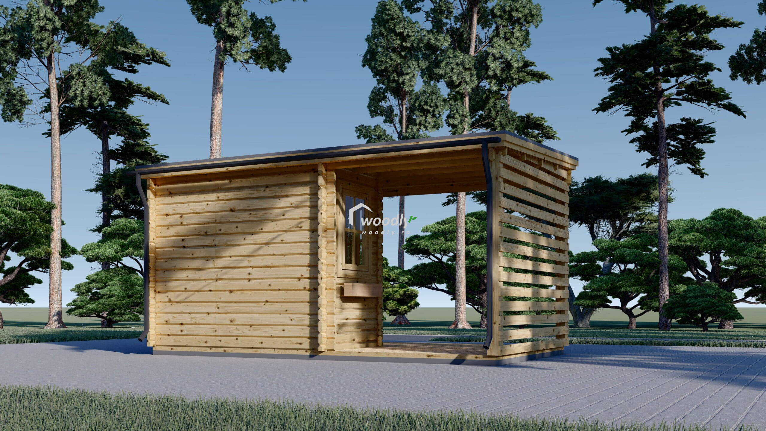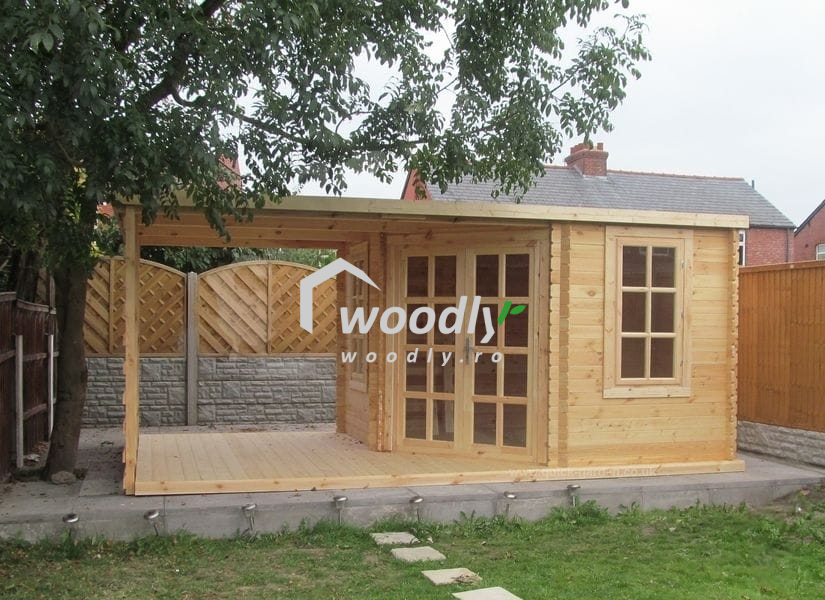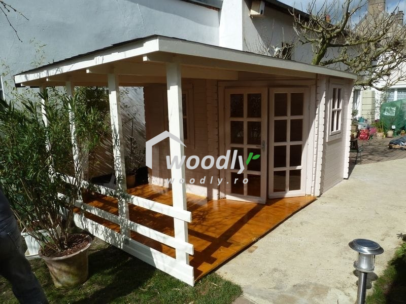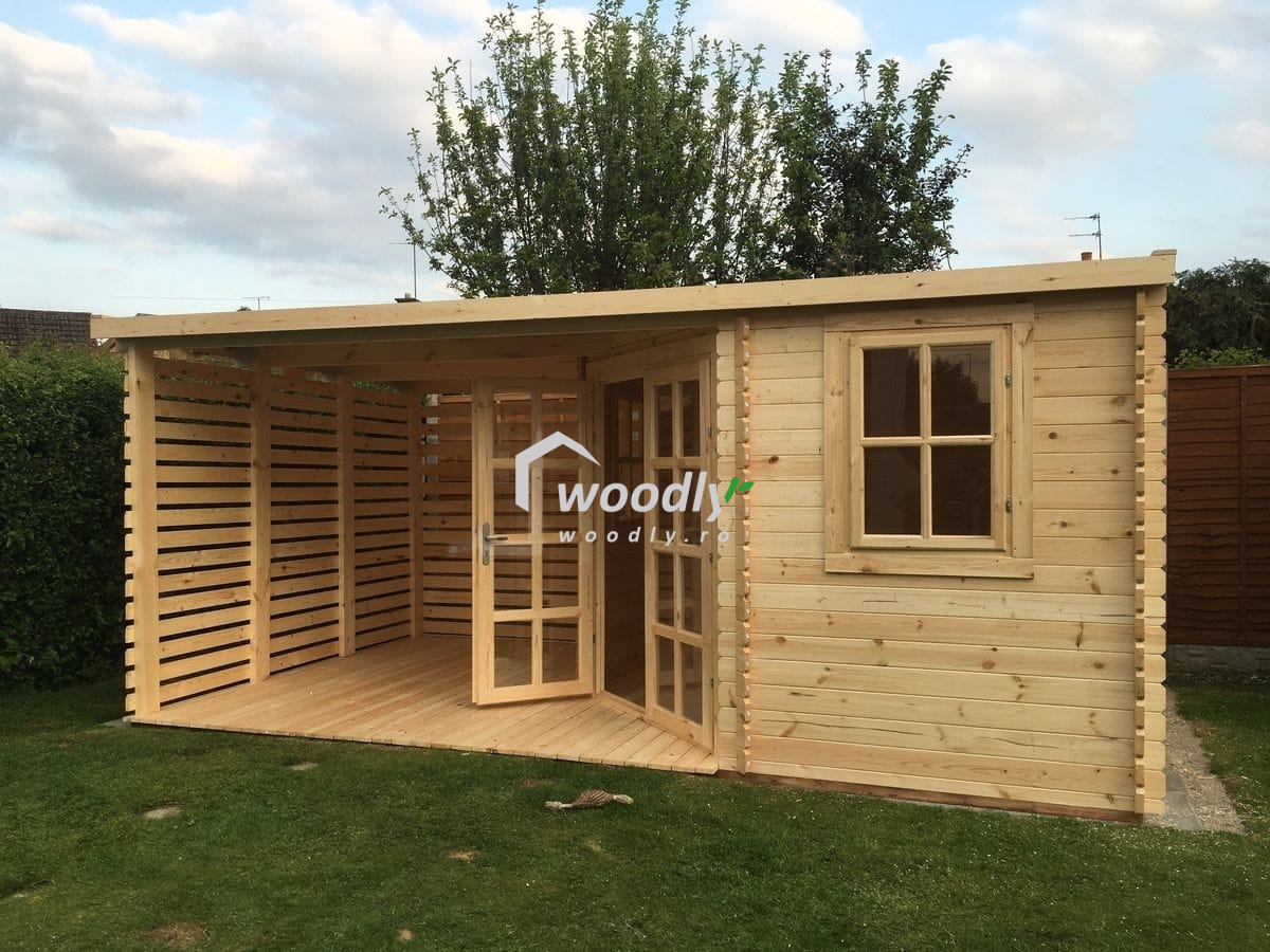 Căsuță de grădină din lemn la cheie, EVA, modulară, 16mp, o cameră, terasă acoperită, perete unic 28mm, 5x3m