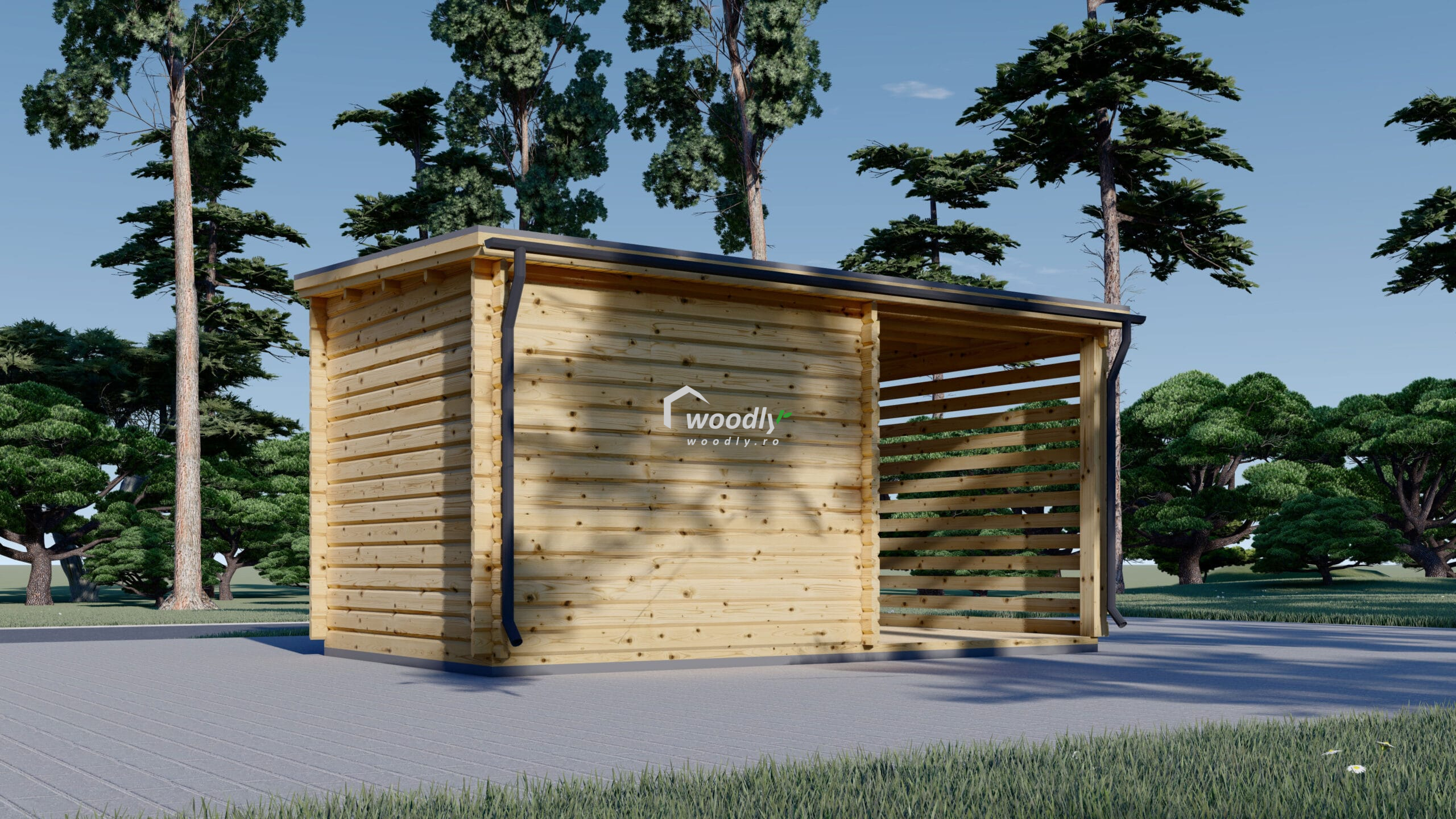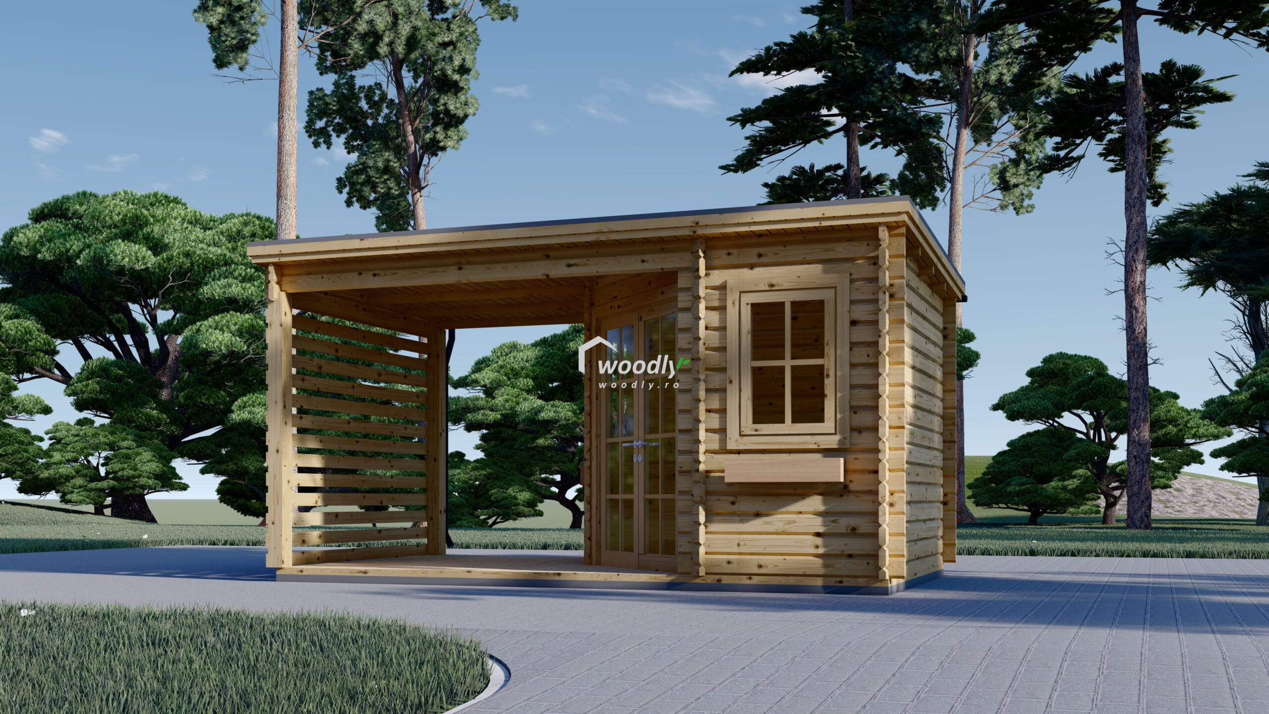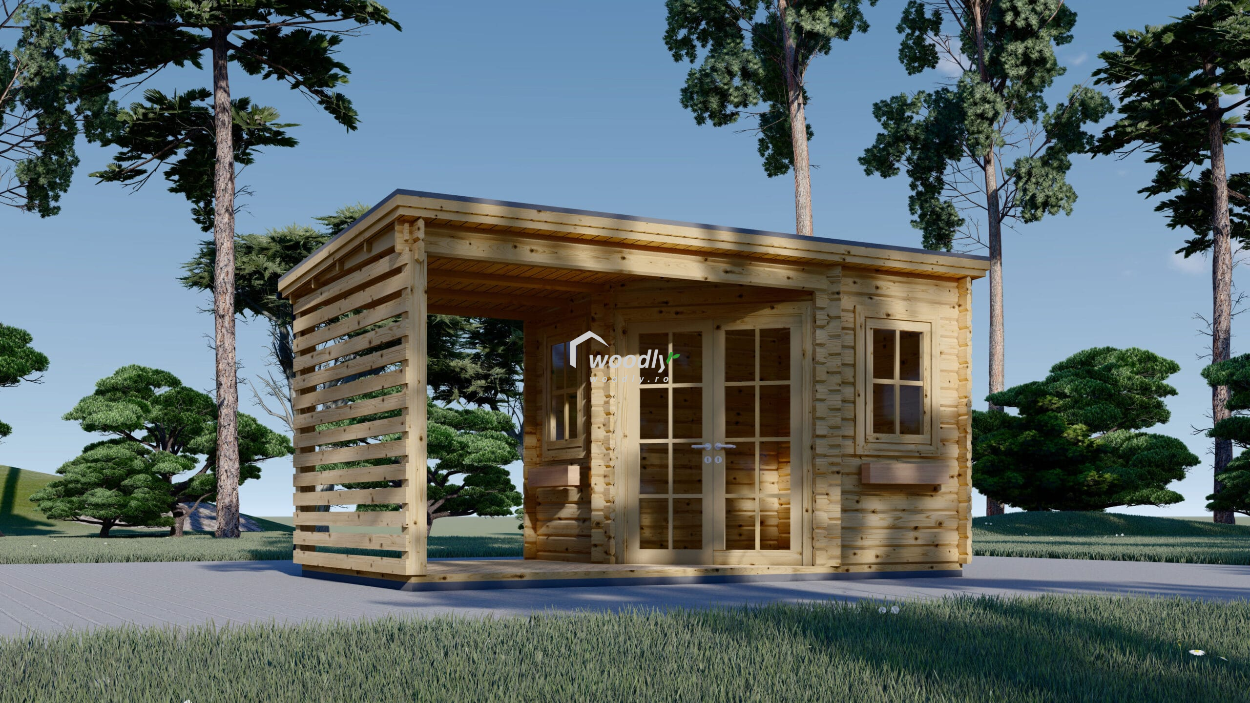 Căsuță de grădină din lemn la cheie, EVA, modulară, 16mp, o cameră, terasă acoperită, perete unic 28mm, 5x3m