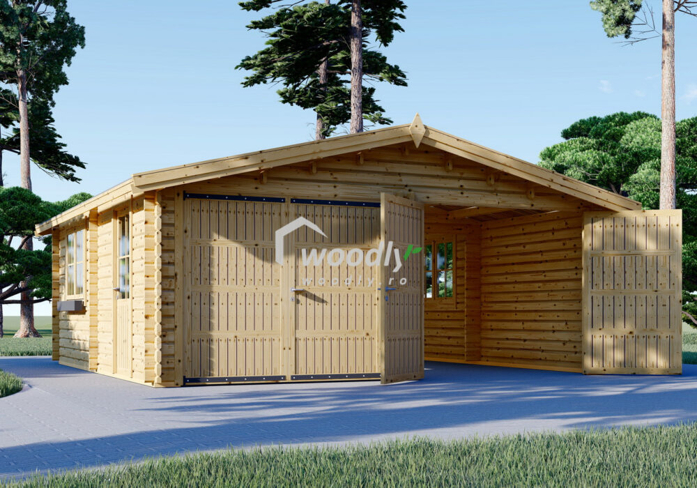 Garajul din lemn CLASSIC DUO, cu o suprafață de 36 mp, oferă spațiu generos pentru două mașini, depozitare suplimentară și un design elegant, integrat perfect în orice curte.