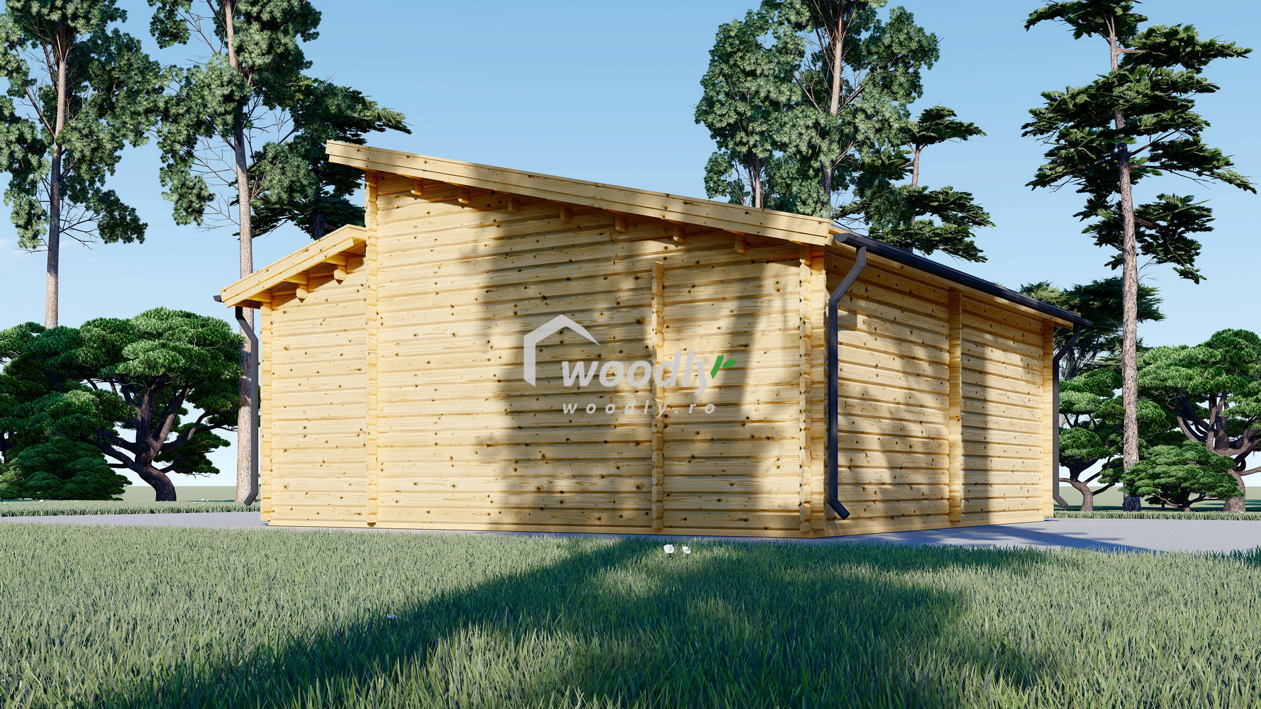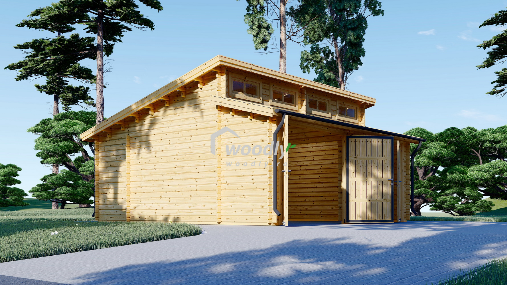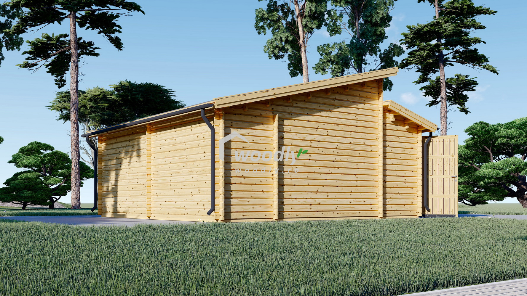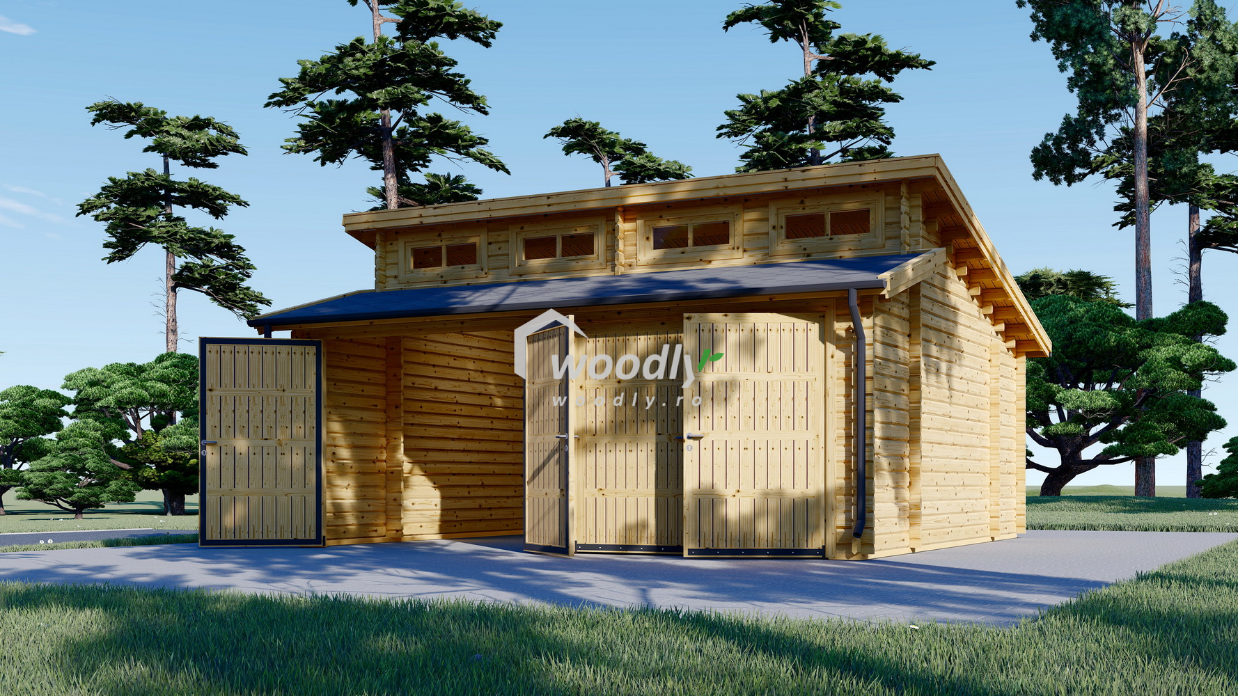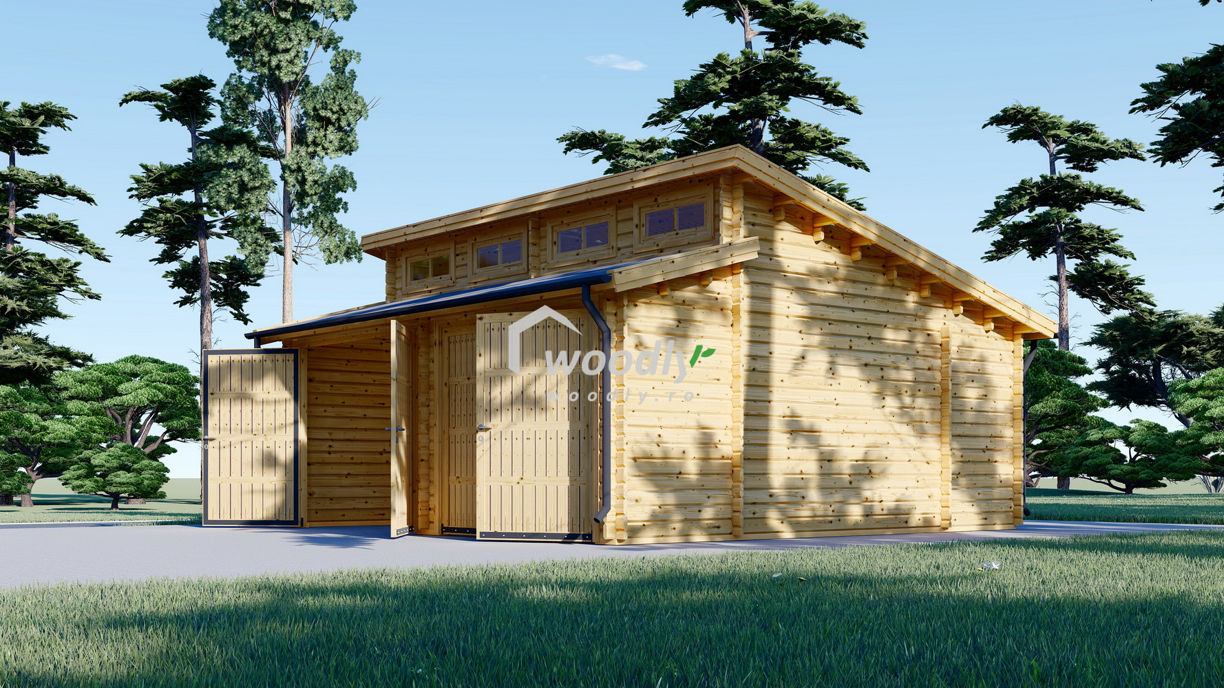 Garaj din lemn TWIN, cu uși robuste, acoperiș înclinat și intrări separate, oferă protecție pentru mașină și un spațiu generos de 24mp pentru depozitare, având un design modern care îmbunătățește aspectul grădinii tale.
